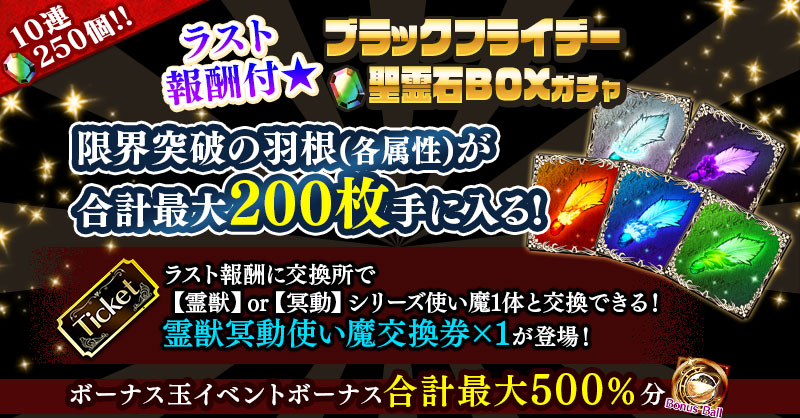 【限界突破の羽根(各属性)が合計最大200枚手に入る!】ラスト報酬付★ブラックフライデー聖霊石BOXガチャ