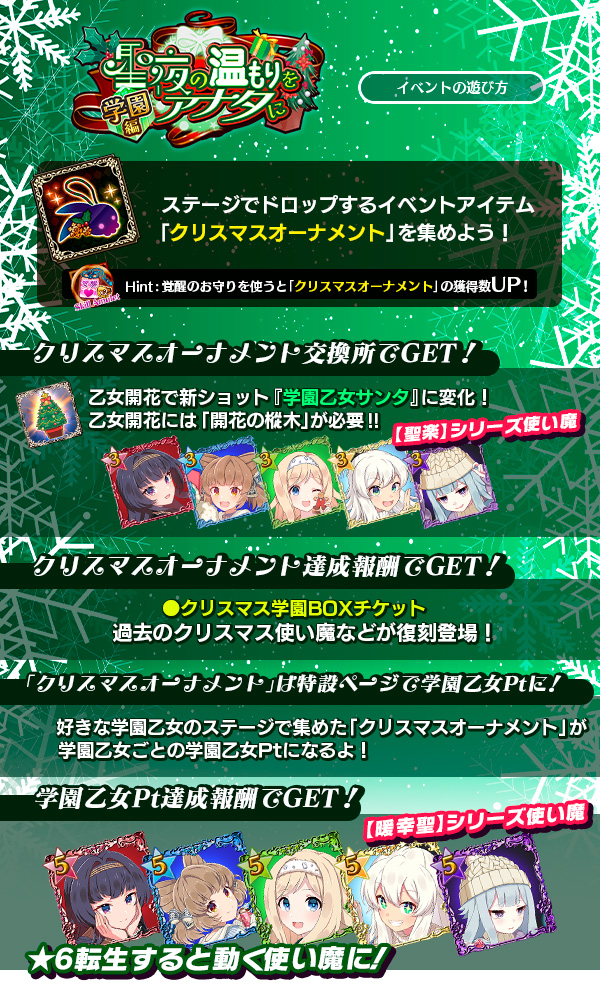 | 開花の樅木 【聖楽】シリーズを乙女開花するとショットが「学園乙女サンタ」に変化する | 各最大1個 | |
