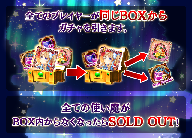 - 【BOX内すべての中身が0】もしくは【BOX内の目玉使い魔の残数が0】になった場合、「SOLD OUT」となり、本シェアBOXガチャを引くことができなくなります。