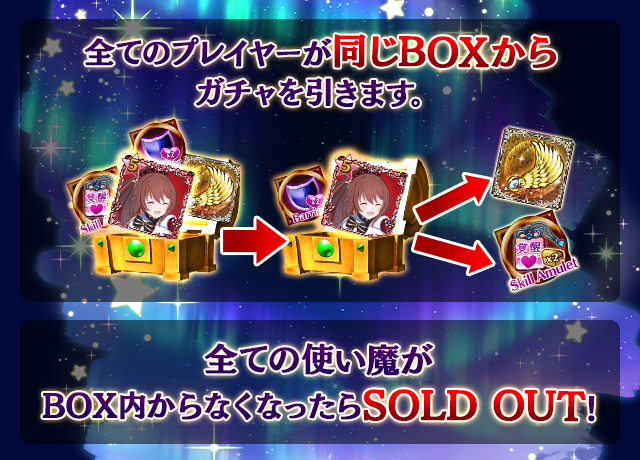 - 【BOX内すべての中身が0】もしくは【BOX内の目玉使い魔の残数が0】になった場合、「SOLD OUT」となり、本シェアBOXガチャを引くことができなくなります。