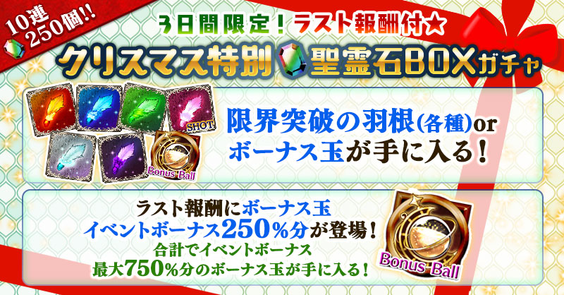 【3日間限定!限界突破の羽根(各種) or ボーナス玉が手に入る!】ラスト報酬付★クリスマス特別聖霊石BOXガチャ