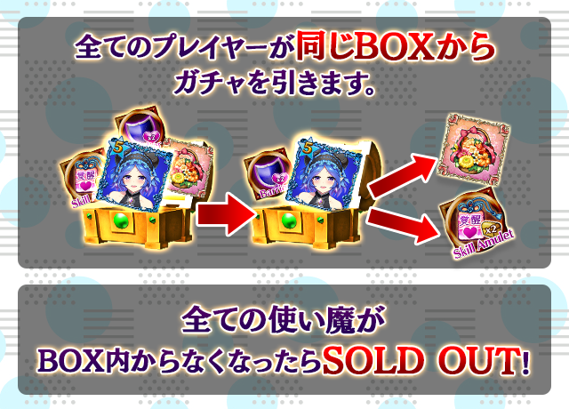 - 【BOX内すべての中身が0】もしくは【BOX内の目玉使い魔の残数が0】になった場合、「SOLD OUT」となり、本シェアBOXガチャを引くことができなくなります。