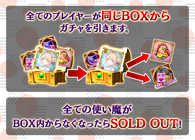 - 【BOX内すべての中身が0】もしくは【BOX内の目玉使い魔の残数が0】になった場合、「SOLD OUT」となり、本シェアBOXガチャを引くことができなくなります。