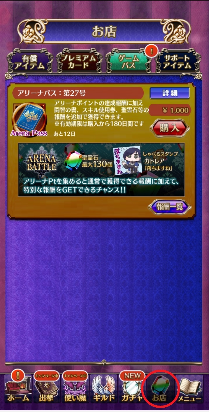 アリーナパスはアプリ内の[お店]>[ゲームパス]にて購入することができます。 アリーナパスで獲得できる追加報酬の一覧も確認することができます。