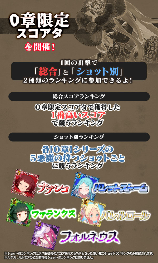 - 【0章】ルチカ、【0章】カルミアは乙女開花後のショットでMVPになった場合、総合のスコアランキングには登録されますが、ショット別ランキングには登録されません。 乙女開花済みの場合は、編成画面で開花前のショットに切り替えることでショット別ランキングに参加できます。