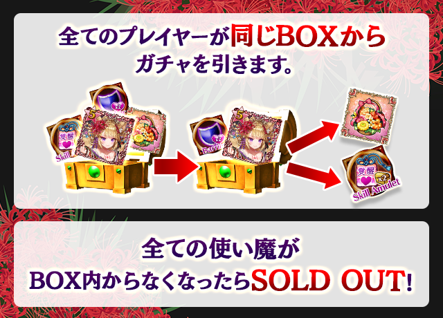 - 【BOX内すべての中身が0】もしくは【BOX内の目玉使い魔の残数が0】になった場合、「SOLD OUT」となり、本シェアBOXガチャを引くことができなくなります。