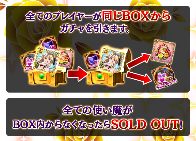 - 【BOX内すべての中身が0】もしくは【BOX内の目玉使い魔の残数が0】になった場合、「SOLD OUT」となり、本シェアBOXガチャを引くことができなくなります。