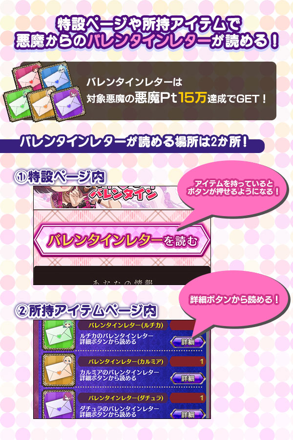| バレンタインレター 特設ページや所持アイテムページ内で対象悪魔からのレターが読める! | 各最大1個 | |
