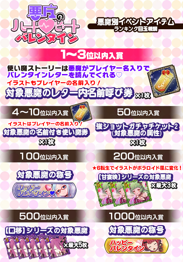 - 報酬使い魔は【ランキング入賞時点で設定されているユーザー名】+【悪魔ごとの敬称】での配布となります。