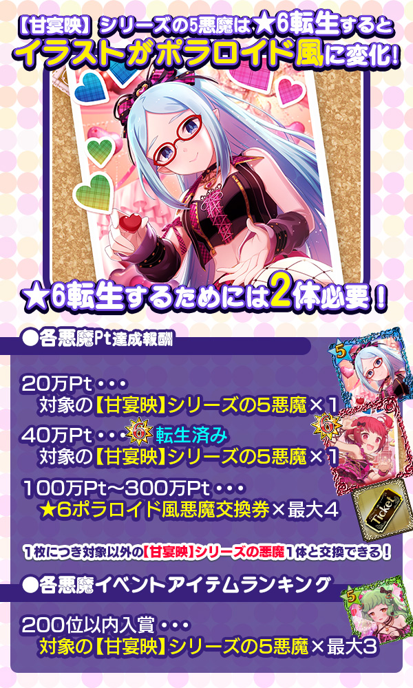 各悪魔40万Pt達成報酬は★6で配布! - さらに、各悪魔Pt達成報酬の「★6ポラロイド風悪魔交換券A~E」は★6転生済みで交換可能!