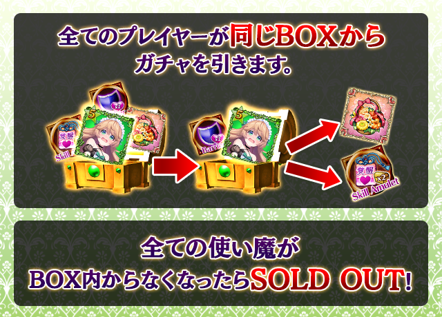 - 【BOX内すべての中身が0】もしくは【BOX内の目玉使い魔の残数が0】になった場合、「SOLD OUT」となり、本シェアBOXガチャを引くことができなくなります。