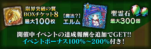 「イベントパス」を所持していると、開催中のイベントポイントに応じて「聖霊石」「限界突破の翼BOXチケット8」「使い魔」などの追加報酬を獲得できます。