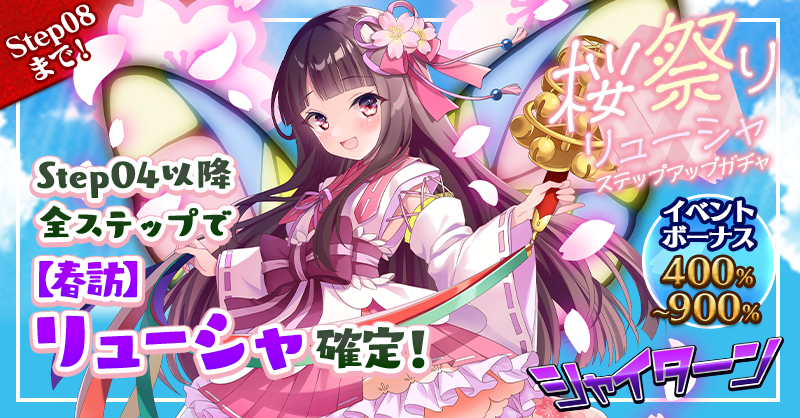 【Step04以降全ステップでイベントボーナス+400%~900%持ち【春訪】リューシャ確定!】桜祭りリューシャステップアップガチャ