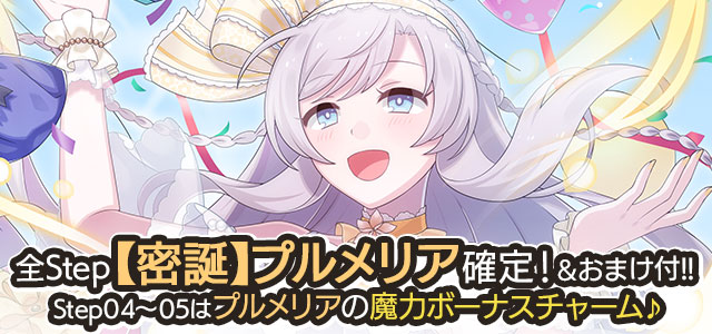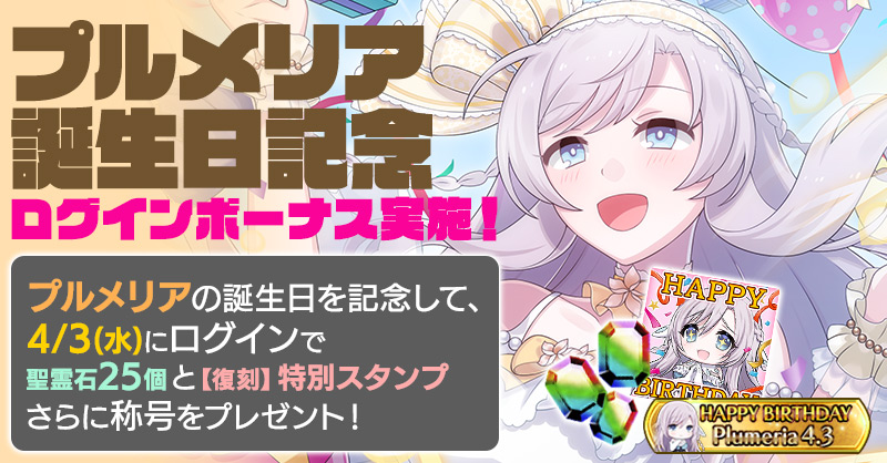 プルメリアの誕生日を記念して、誕生日当日にログインすると「聖霊石:25個」と、掲示板で使用できる【復刻】特別スタンプや、称号をプレゼント!!