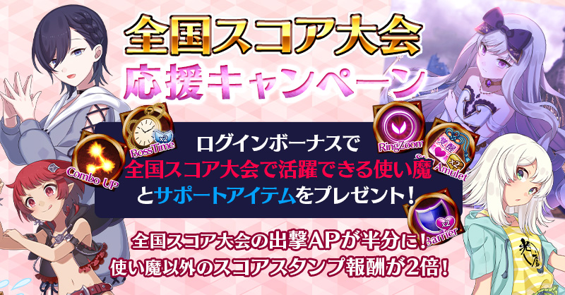 期間中の土曜日にログインでサポートアイテム5種&スコアタで活躍できる使い魔 をプレゼント!