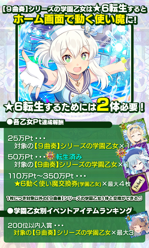 各学園乙女50万Pt達成報酬は★6で配布! - さらに、各学園乙女Pt達成報酬の「★6動く使い魔交換券(学園乙女)A~E」は★6転生済みで交換可能!