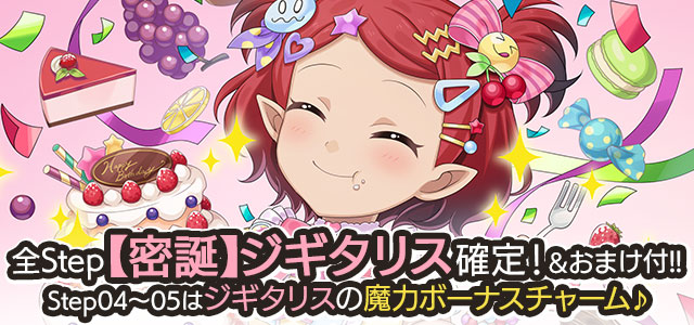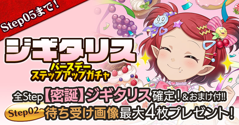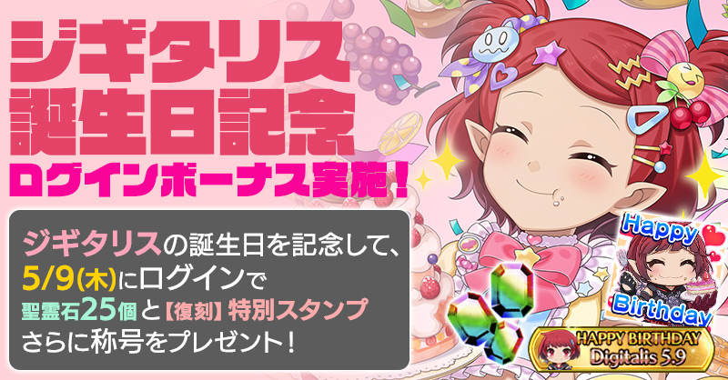 ジギタリスの誕生日を記念して、誕生日当日にログインすると「聖霊石:25個」と、掲示板で使用できる【復刻】特別スタンプや、称号をプレゼント!!