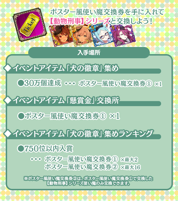 | 復刻使い魔交換券 黒金・黄金ショット持ち使い魔などと交換できる! | 最大30枚 | |
