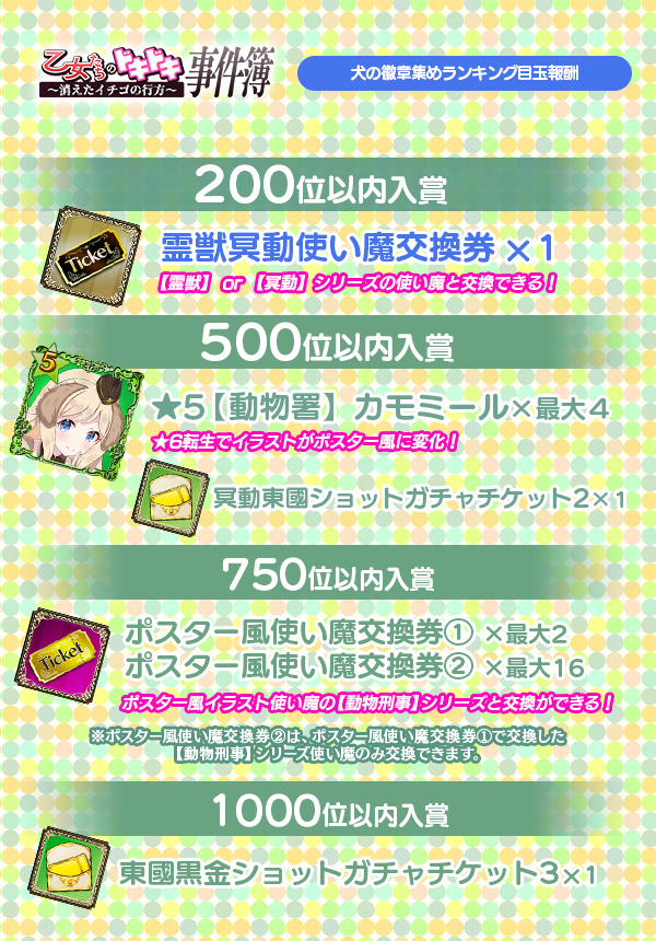 | 3000位 入賞 | スコアタオススメ使い魔交換券Ⅲ 冥動・東國・黒金ショット持ち使い魔がラインナップ | 最大3枚 |