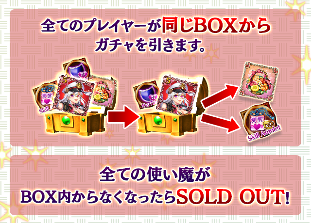 - 【BOX内すべての中身が0】もしくは【BOX内の目玉使い魔の残数が0】になった場合、「SOLD OUT」となり、本シェアBOXガチャを引くことができなくなります。