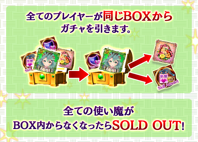 - 【BOX内すべての中身が0】もしくは【BOX内の目玉使い魔の残数が0】になった場合、「SOLD OUT」となり、本シェアBOXガチャを引くことができなくなります。