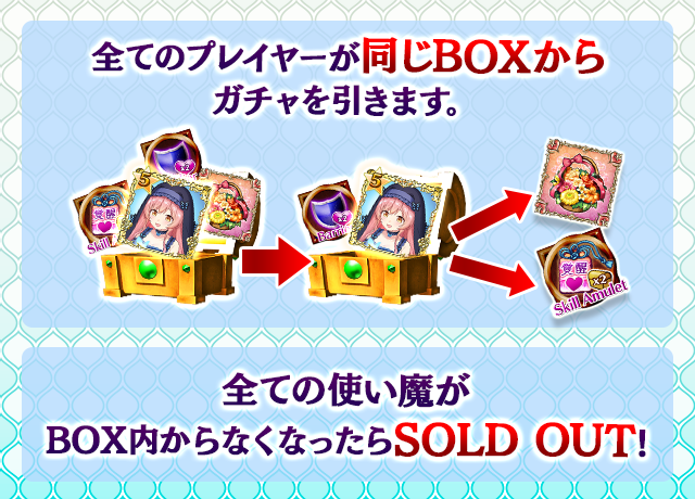 - 【BOX内すべての中身が0】もしくは【BOX内の目玉使い魔の残数が0】になった場合、「SOLD OUT」となり、本シェアBOXガチャを引くことができなくなります。
