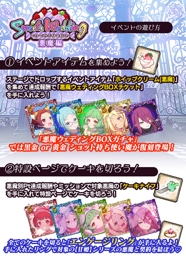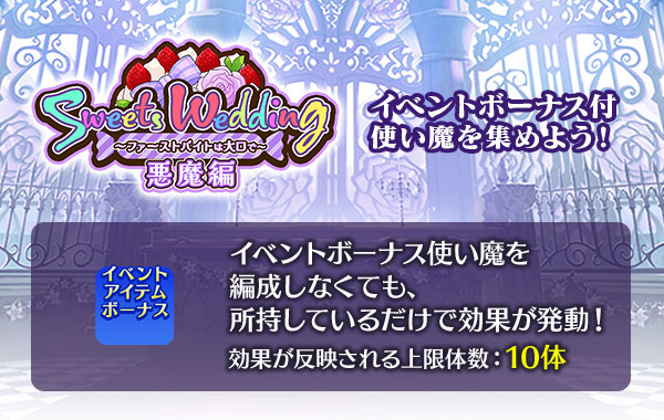 イベント「スイーツウェディング~ファーストバイトは大口で~ 悪魔編」の前半ステージについて、想定と異なる難易度の高いステージとなっている不具合を確認したため、本不具合の対応として、イベント後半ステージを6/11(火)17:30より解放いたします。