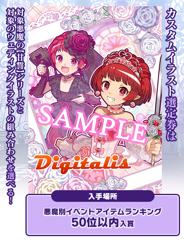 例:ジギタリスのカスタムイラスト選定券をお持ちの場合は、「【甘誓】ジギタリス&【戦花嫁】ジギタリス」等 - イラストは同一悪魔の組み合わせのみとなります。ジギタリスランキングのカスタムイラスト選定券はジギタリス2種類での組み合わせ、リリーランキングのカスタムイラスト選定券はリリー2種類での組み合わせとなります。