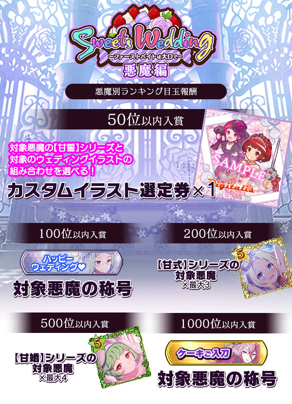 - イラストは「【甘誓】シリーズの対象悪魔×ウェディングイラストの対象悪魔」の組み合わせから選択できます。