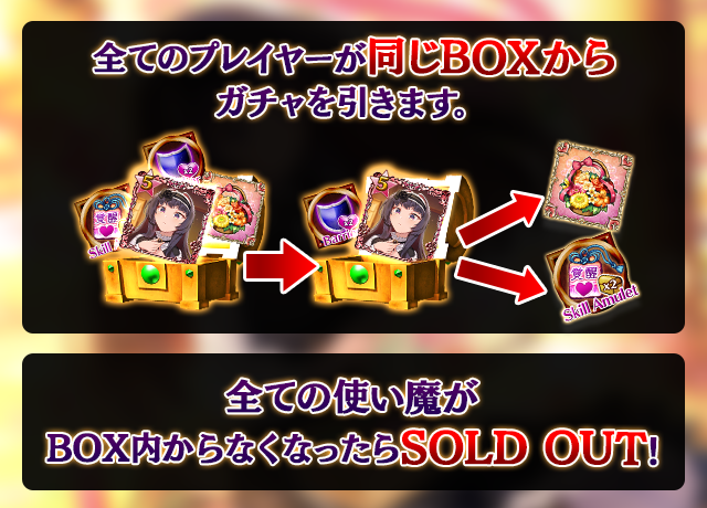 - 【BOX内すべての中身が0】もしくは【BOX内の目玉使い魔の残数が0】になった場合、「SOLD OUT」となり、本シェアBOXガチャを引くことができなくなります。