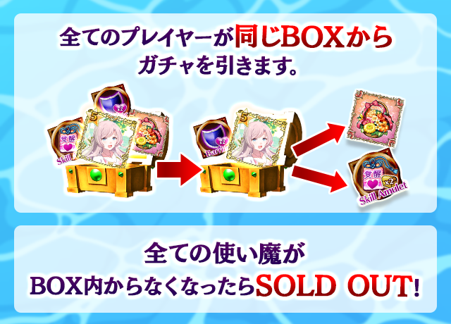 - 【BOX内すべての中身が0】もしくは【BOX内の目玉使い魔の残数が0】になった場合、「SOLD OUT」となり、本シェアBOXガチャを引くことができなくなります。
