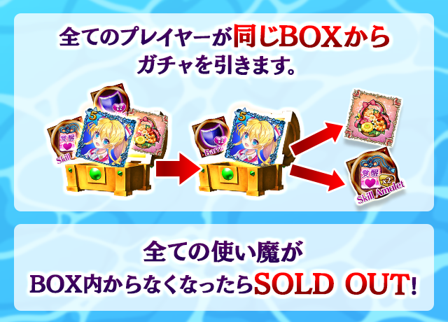 - 【BOX内すべての中身が0】もしくは【BOX内の目玉使い魔の残数が0】になった場合、「SOLD OUT」となり、本シェアBOXガチャを引くことができなくなります。