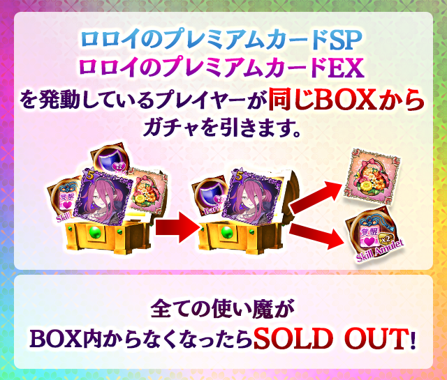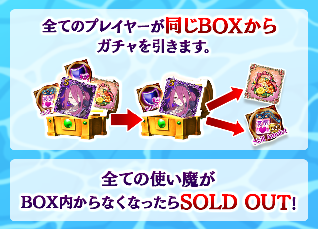- 【BOX内すべての中身が0】もしくは【BOX内の目玉使い魔の残数が0】になった場合、「SOLD OUT」となり、本シェアBOXガチャを引くことができなくなります。