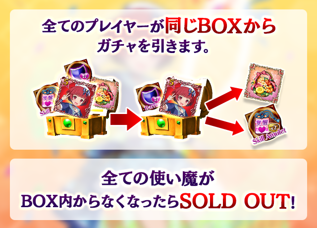 - 【BOX内すべての中身が0】もしくは【BOX内の目玉使い魔の残数が0】になった場合、「SOLD OUT」となり、本シェアBOXガチャを引くことができなくなります。