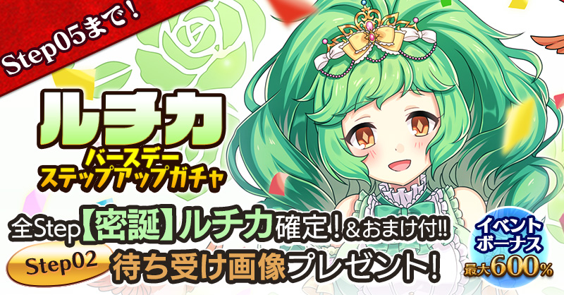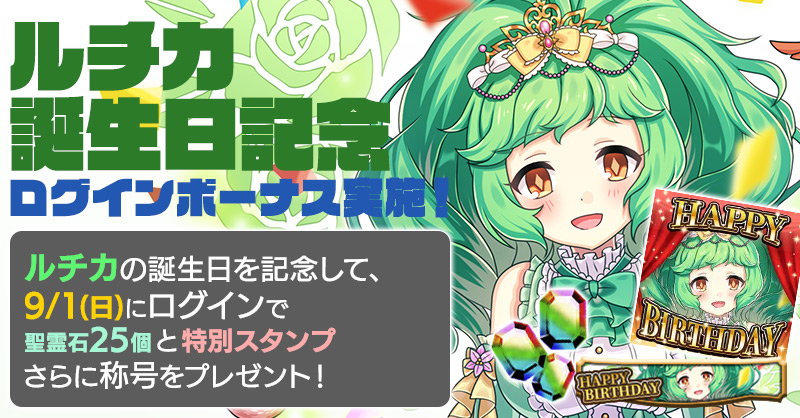 ルチカの誕生日を記念して、誕生日当日にログインすると「聖霊石:25個」と、掲示板で使用できる特別スタンプや、称号をプレゼント!!