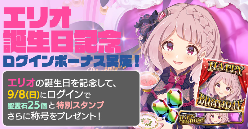 エリオの誕生日を記念して、誕生日当日にログインすると「聖霊石:25個」と、掲示板で使用できる特別スタンプや、称号をプレゼント!!