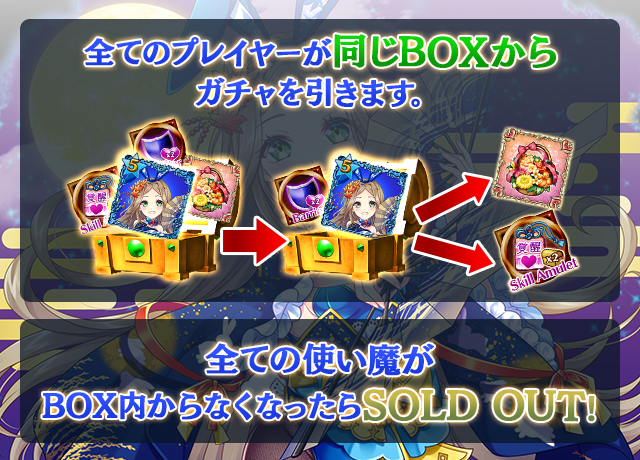 - 【BOX内すべての中身が0】もしくは【BOX内の目玉使い魔の残数が0】になった場合、「SOLD OUT」となり、本シェアBOXガチャを引くことができなくなります。