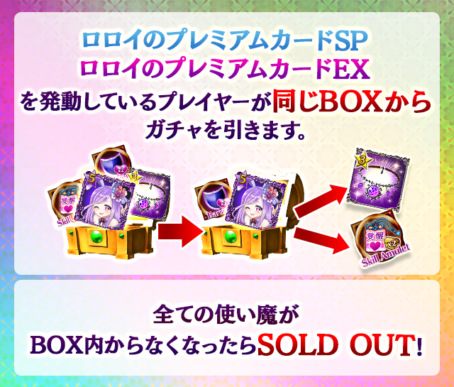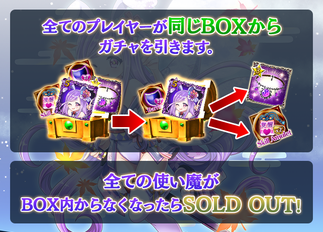 - 【BOX内すべての中身が0】もしくは【BOX内の目玉使い魔の残数が0】になった場合、「SOLD OUT」となり、本シェアBOXガチャを引くことができなくなります。