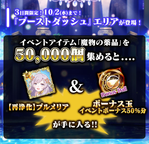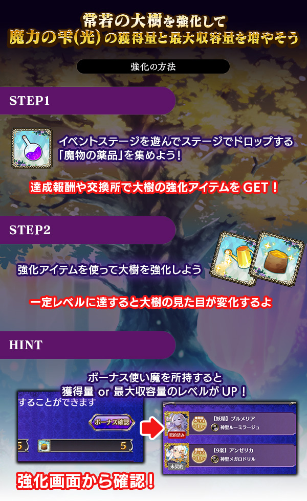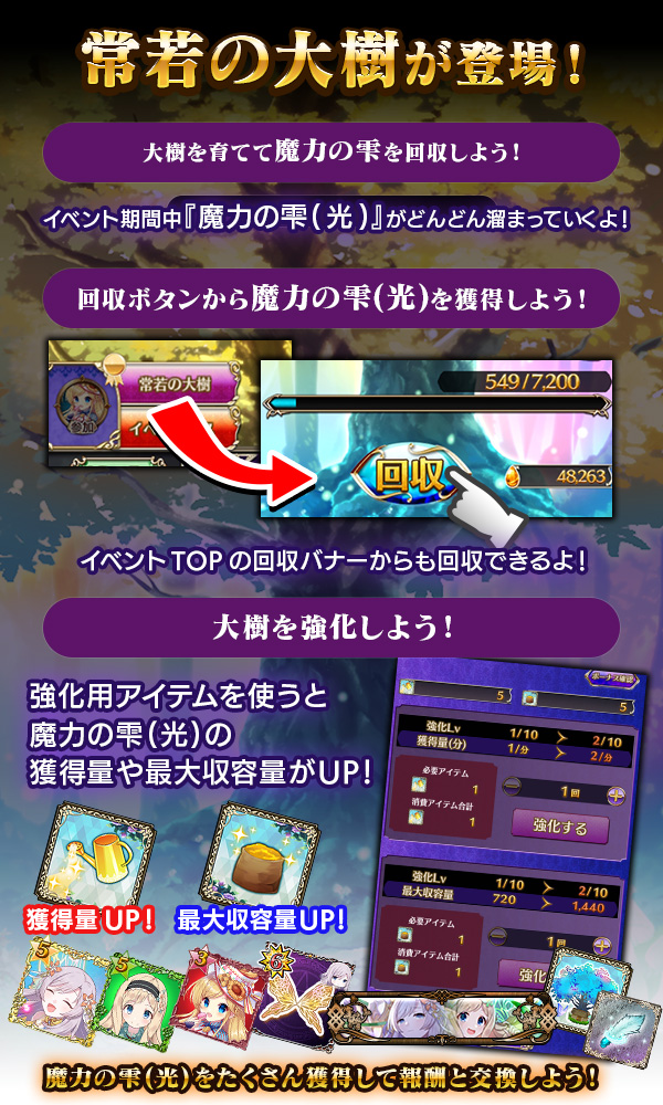 2024/10/10(木)0:00~メンテナンス開始までは溜まっている魔力の雫(光)の回収や大樹の強化、即時獲得の機能は使用できます。