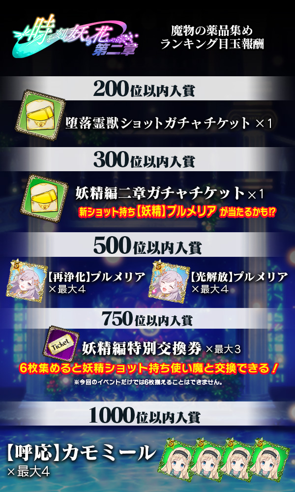 - 達成報酬はホーム画面[イベント]ボタン上のランキングボタン>[各種ランキング]内の[報酬を見る]や[ポイント達成報酬を見る]より確認できます。