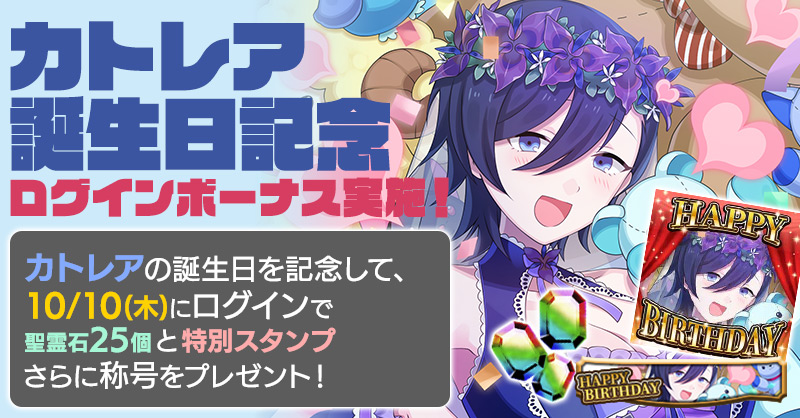 カトレアの誕生日を記念して、誕生日当日にログインすると「聖霊石:25個」と、掲示板で使用できる特別スタンプや、称号をプレゼント!!
