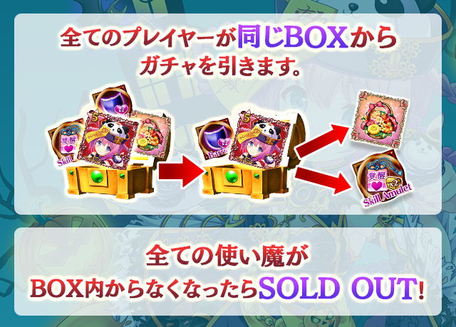 - 【BOX内すべての中身が0】もしくは【BOX内の目玉使い魔の残数が0】になった場合、「SOLD OUT」となり、本シェアBOXガチャを引くことができなくなります。