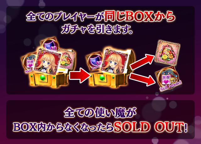 - 【BOX内すべての中身が0】もしくは【BOX内の目玉使い魔の残数が0】になった場合、「SOLD OUT」となり、本シェアBOXガチャを引くことができなくなります。