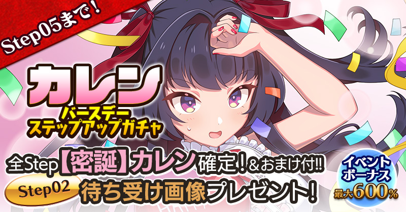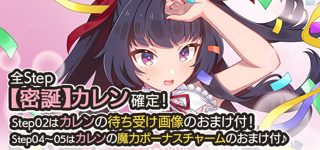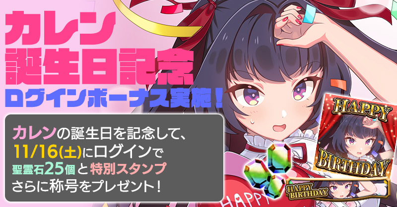 カレンの誕生日を記念して、誕生日当日にログインすると「聖霊石:25個」と、掲示板で使用できる特別スタンプや、称号をプレゼント!!