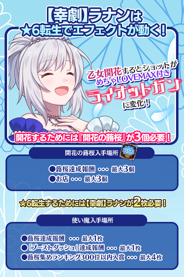 | 開花の苗木(学園) 学園乙女用の開花素材 開花でショットやスキルが変化 | 最大4個 |