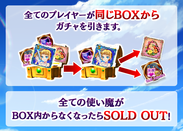 - 【BOX内すべての中身が0】もしくは【BOX内の目玉使い魔の残数が0】になった場合、「SOLD OUT」となり、本シェアBOXガチャを引くことができなくなります。