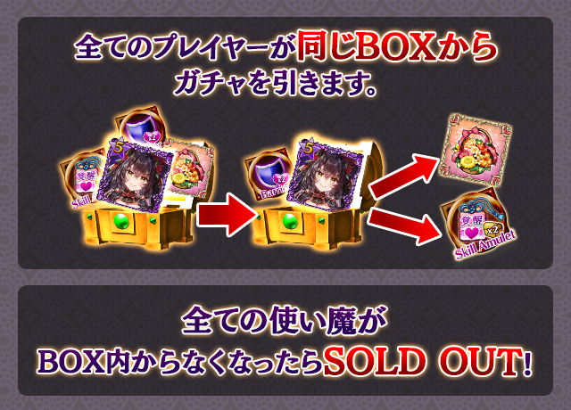 - 【BOX内すべての中身が0】もしくは【BOX内の目玉使い魔の残数が0】になった場合、「SOLD OUT」となり、本シェアBOXガチャを引くことができなくなります。