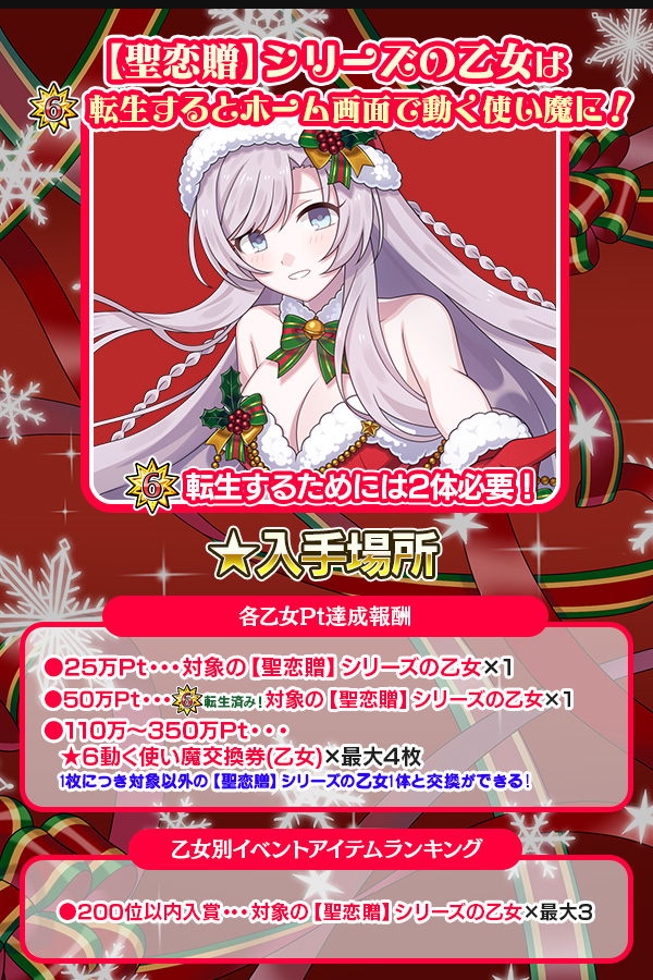 | レギュレーション | キャラクター限定:【聖贈】【聖箱】【聖恋贈】【聖箱筆】シリーズの対象の5乙女 アイテム使い放題 | ||