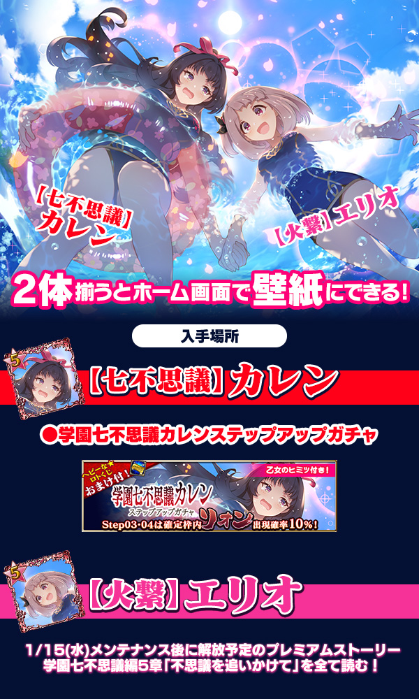 さらに、ガチャで手に入る【七不思議】カレンと2体揃えるとホーム画面の壁紙にできるよ♡