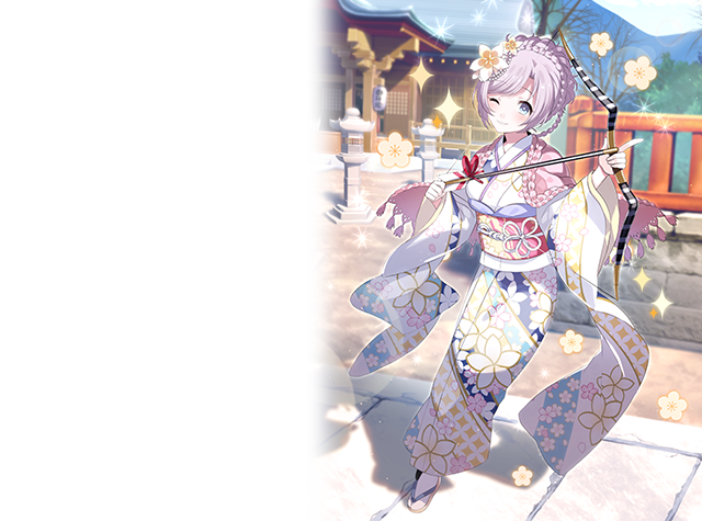 年始の晴れ着として、振袖を着たプルメリア。初詣で手に入れた破魔矢のことが気になる。これはどういう武器なのでしょう?